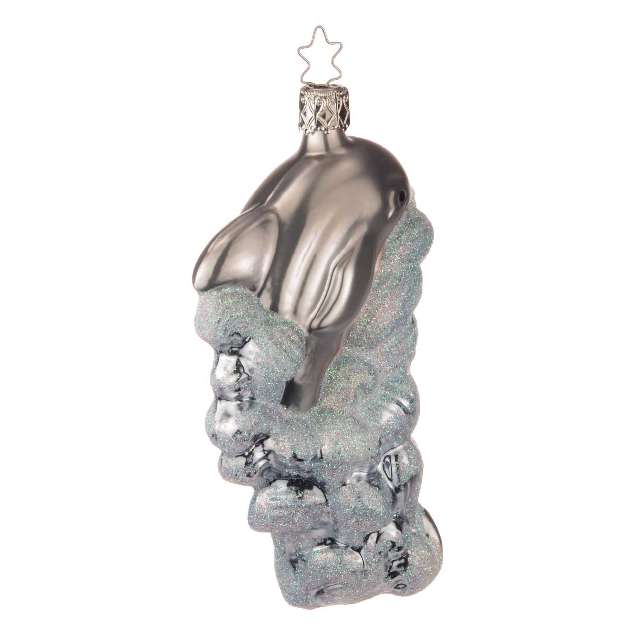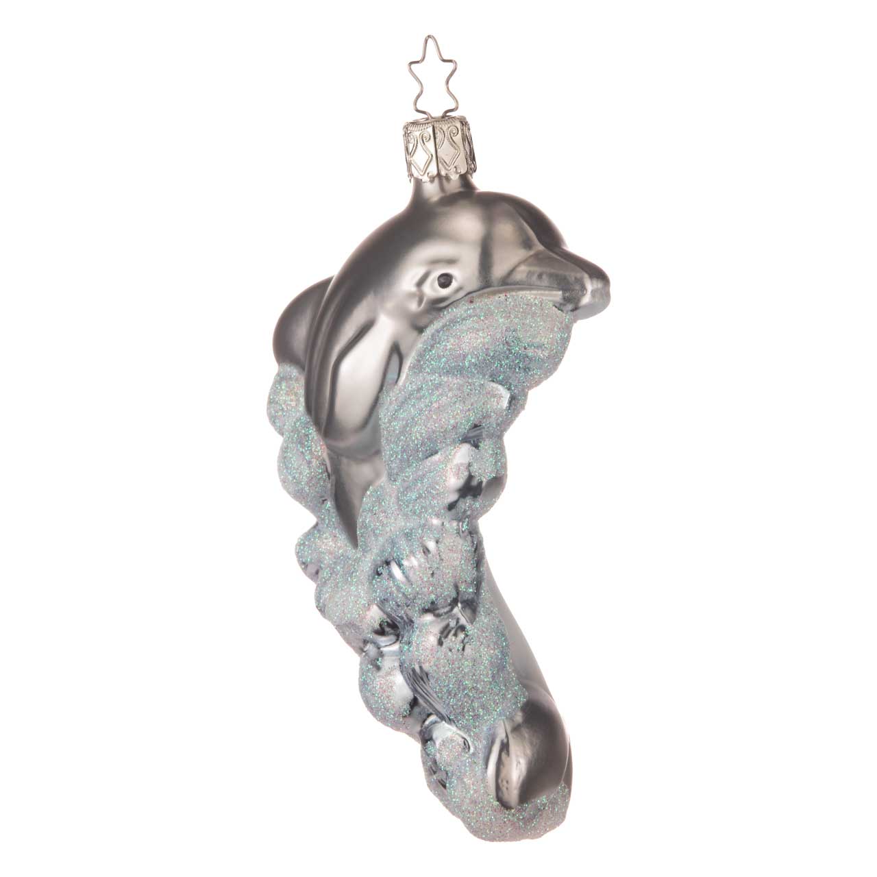La figura representa un delfín brillante y plateado que surge de las olas centelleantes. El cuerpo tiene una forma elegante y está diseñado en plata metálica, mientras que las olas brillan en un resplandeciente azul plateado. Una representación dinámica y armoniosa al mismo tiempo, que resulta fresca y elegante gracias a su combinación de colores