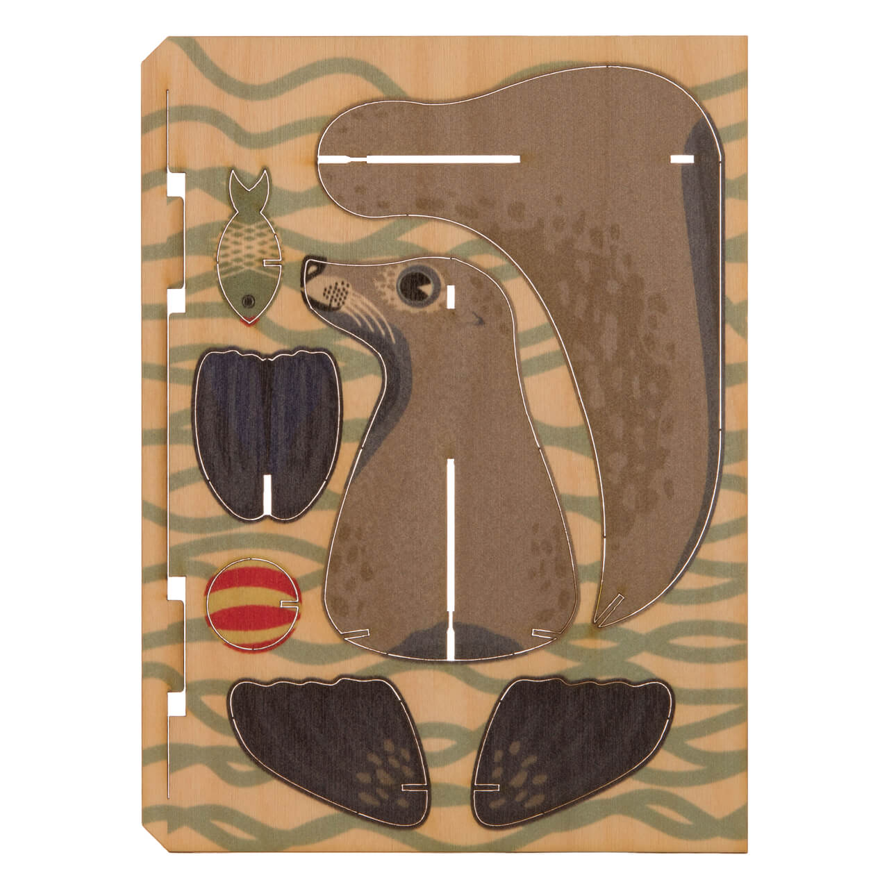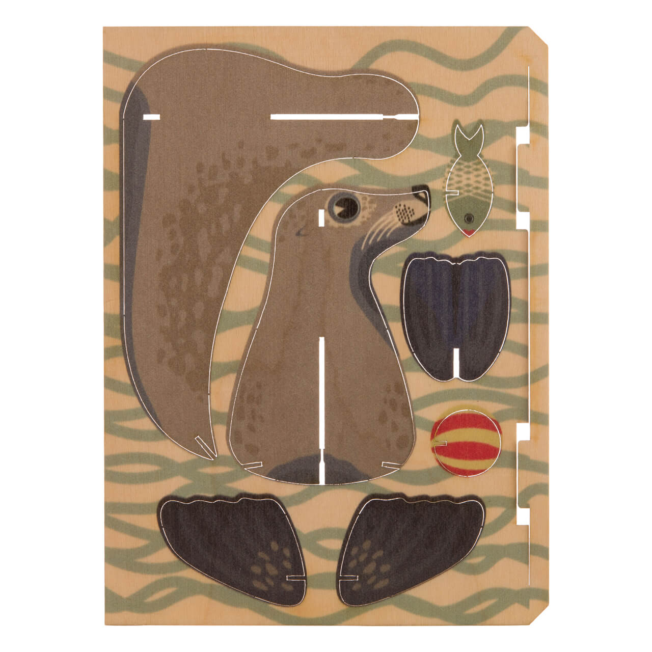 Más que palabras, más que una tarjeta: quien abra este sobre se quedará boquiabierto. Porque no es sólo una tarjeta doble A6 de papel azul claro con la silueta azul oscuro de un león marino que transmite los amables saludos de una buena amistad. También sale de ella una fina tarjeta de madera contrachapada de abedul de 1 mm de grosor con instrucciones en alemán, inglés y francés.