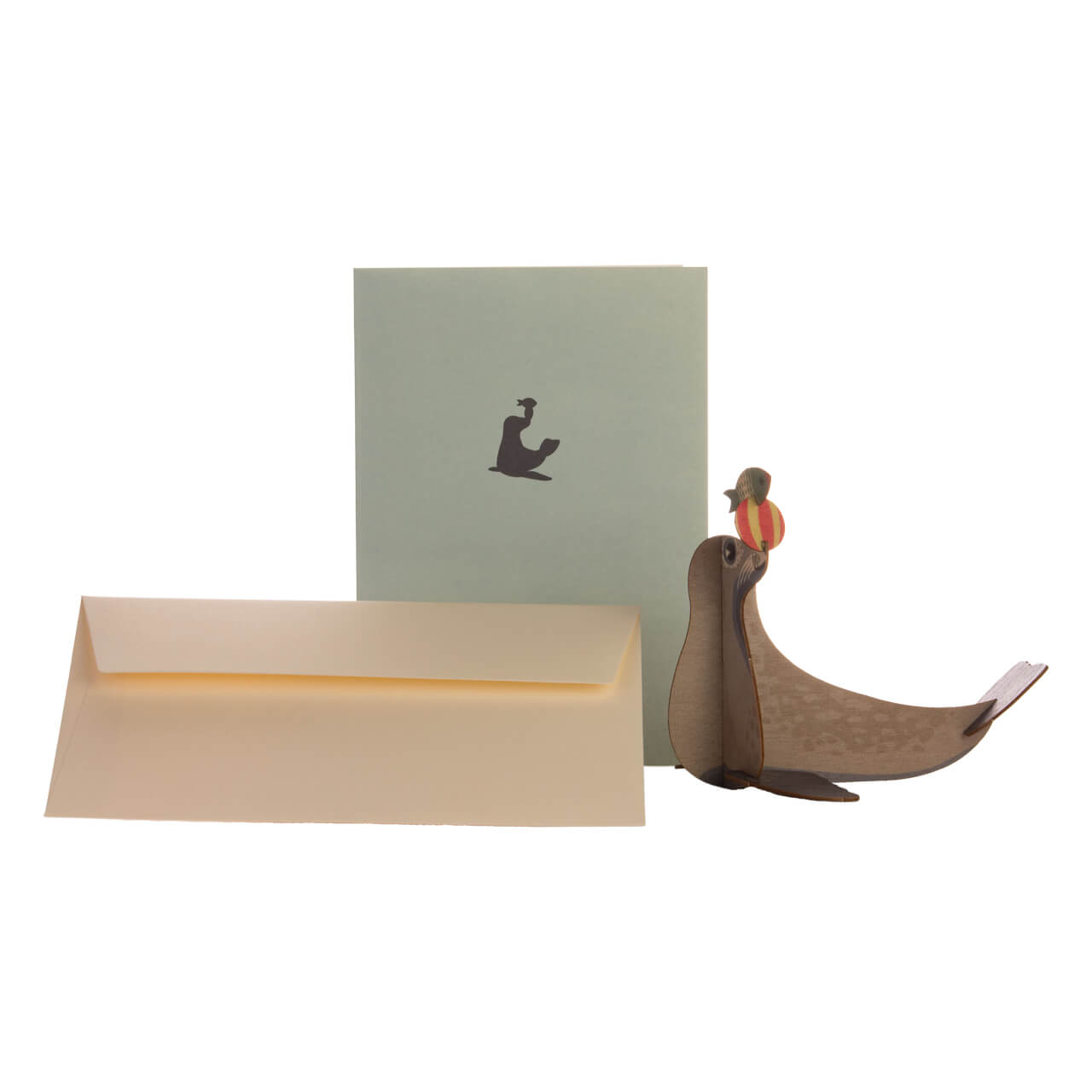 La emocionante tarea para el destinatario consiste en recortar cuidadosamente todas las piezas cortadas con láser, utilizando un cúter si es necesario, y ensamblarlas hábilmente en un objeto tridimensional DeKo siguiendo las instrucciones. Colocada en el cuarto de baño, en el lugar de trabajo o en el alféizar de la ventana, la graciosa figurita creará de inmediato un ambiente festivo, y le recordará la simpática felicitación durante semanas después de abrirla. Porque este animalito es memorable: un león marino gris de aspecto simpático estira la cabeza atentamente hacia la derecha y presenta un truco muy especial en su hocico barbudo. No sólo una pelota a rayas rojas y blancas, sino también un pez azul de forma clásica se amontonan en el hocico del león marino para hacer un hábil equilibrismo.
