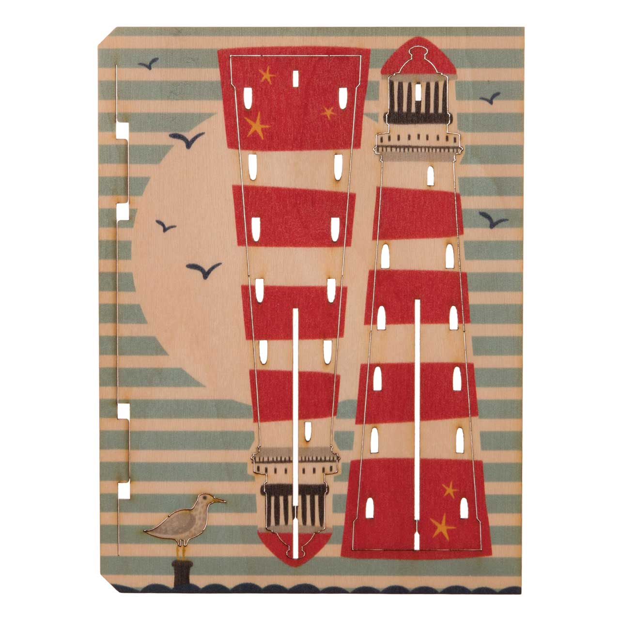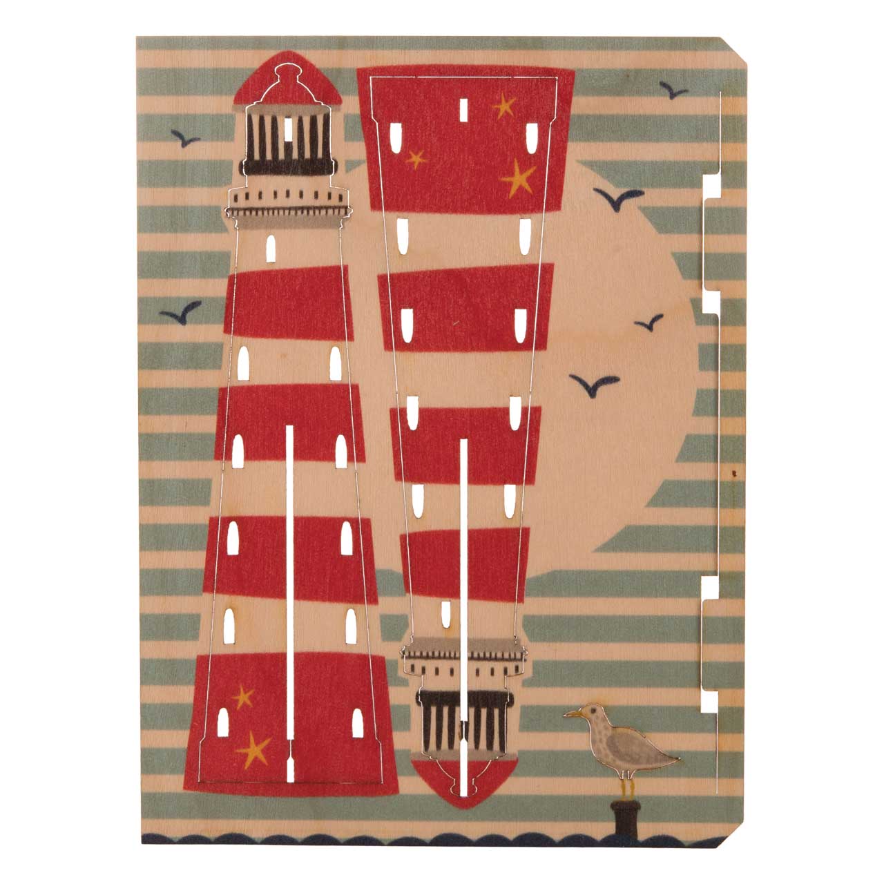 Más que unas palabras, más que una tarjeta: quien abra este sobre se quedará boquiabierto. Porque no es sólo una tarjeta doble A6 de papel color arena con la silueta roja de un faro que transmite los amables saludos de una buena amistad. También sale de ella una fina tarjeta de madera contrachapada de abedul de 1 mm de grosor con instrucciones en alemán, inglés y francés.