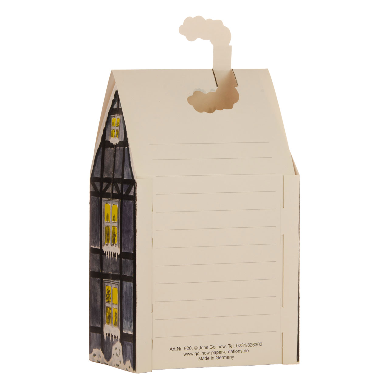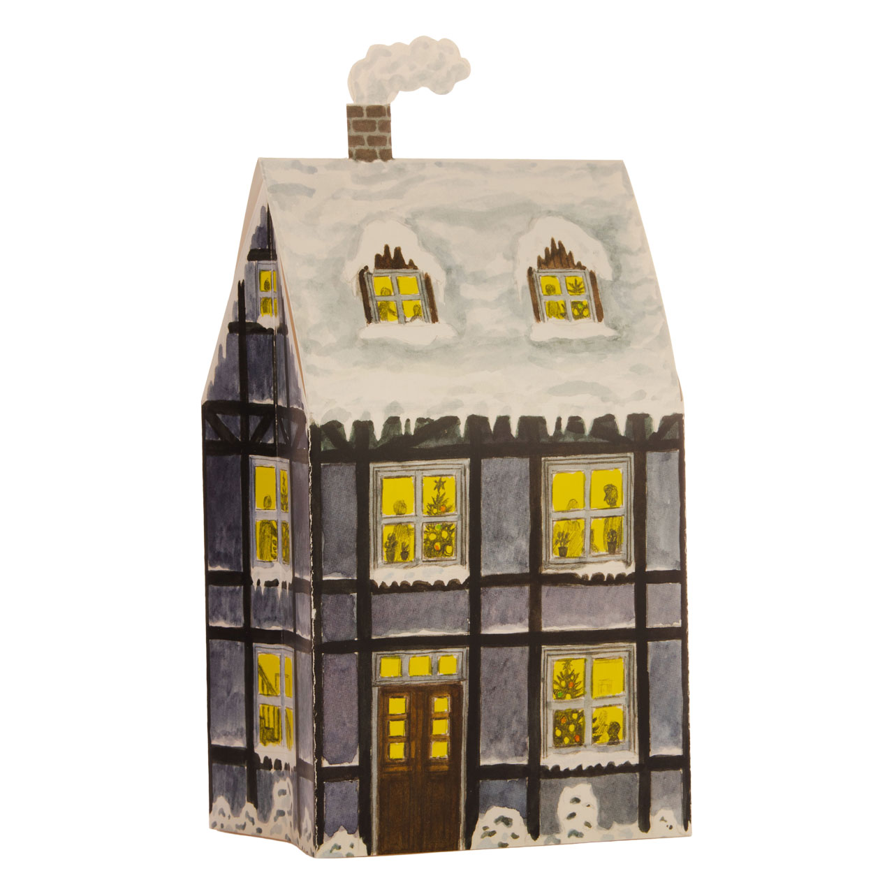 ¿A usted también le gusta pasear por las calles en invierno bajo el frío glacial y echar un vistazo aquí y allá a las ventanas cálidamente iluminadas de las casas, de las que irradia puro acogimiento? Por supuesto, esto es más bonito en Navidad, cuando los árboles de Navidad decorados festivamente brillan en los acogedores salones y las familias se han reunido en alegre compañía. Esta postal muestra una escena semejante en papel grueso impreso a todo color, que puede desplegarse en una majestuosa y tradicional casa de entramado de madera de tres plantas en unos sencillos pasos. Cubierta de blanco, la nieve se amontona en el tejado y en los alféizares de las ventanas, por la chimenea sale un denso humo y las ventanas proyectan luz amarilla y revelan momentos navideños. Un objeto decorativo que puede colocarse en la mesa del café o en el alféizar de la ventana y que garantiza alegrar algo más que los oscuros días de invierno; las simpáticas líneas, para las que se ha previsto un espacio blanco y rayado en la parte trasera de la casa, pueden leerse una y otra vez y, por tanto, seguro que se recordarán durante mucho más tiempo.